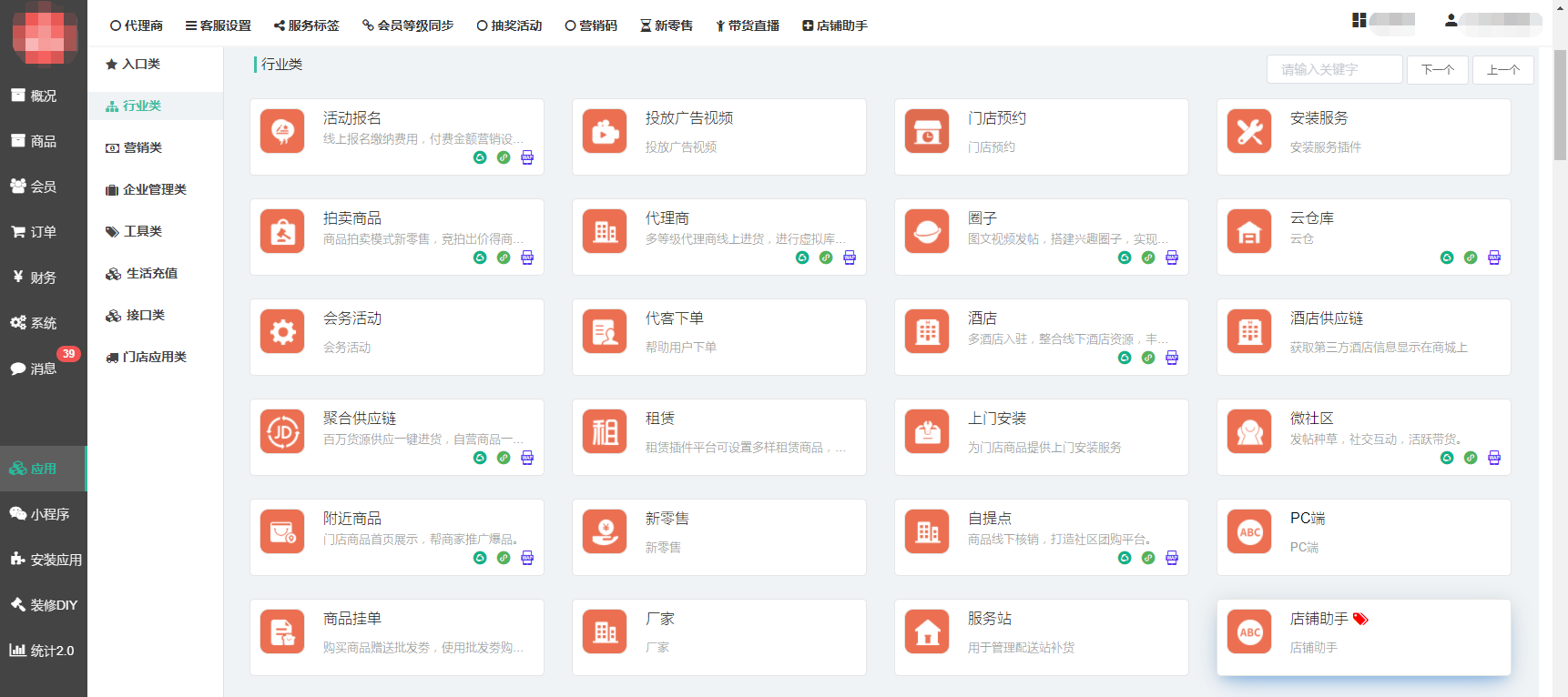功能路径:总后台-应用-行业类-店铺助手
