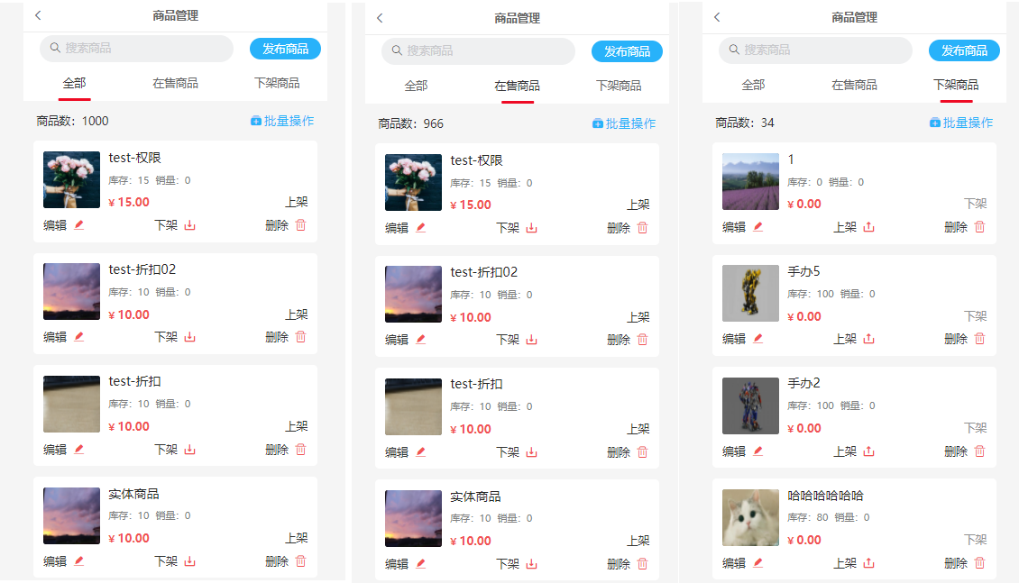 (2)在售商品:编辑、下架、删除