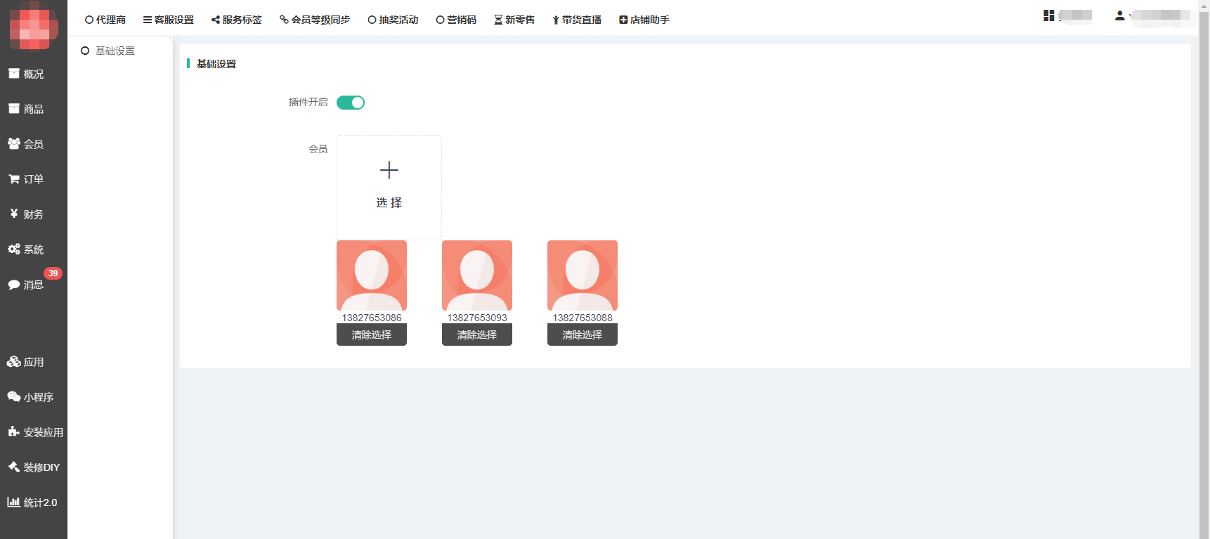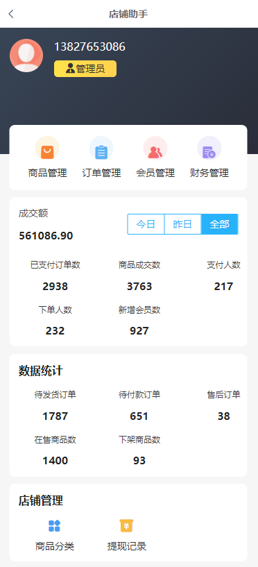 会员被添加为店铺助手管理员后,可在前端管理商城的商品、订单、会员、财务等。