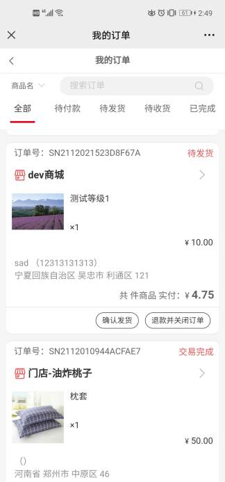 (3)操作:查看订单详情、确认付款、确认发货(快递公司、快递单号)、关闭订单、查看物流、退款并关闭订单等