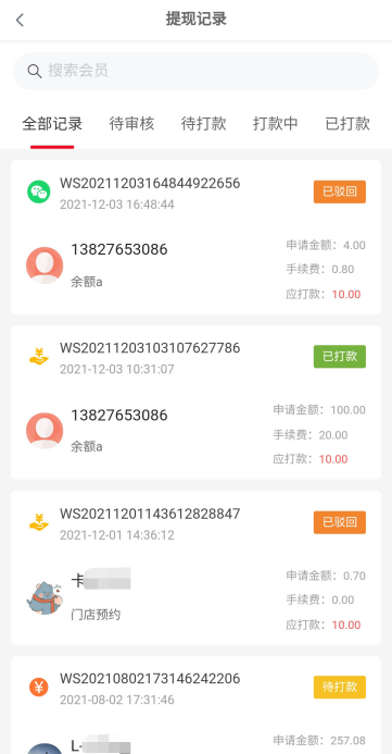 (2)筛选:全部记录、待审核、待打款、打款中、已打款、已驳回、无效提现