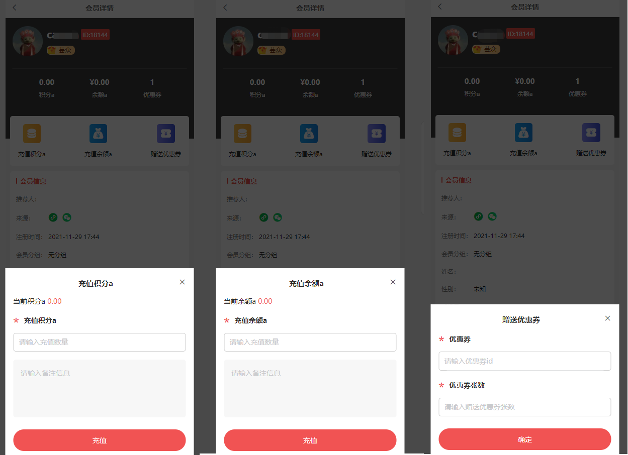 (3)充值积分、充值余额、赠送优惠券