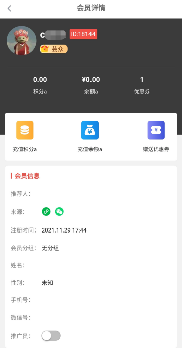 (2)会员信息:积分、余额、优惠券、推荐人、来源、注册时间、会员分组、姓名、性别、手机号、微信号、是否推广员、支付账号信息等