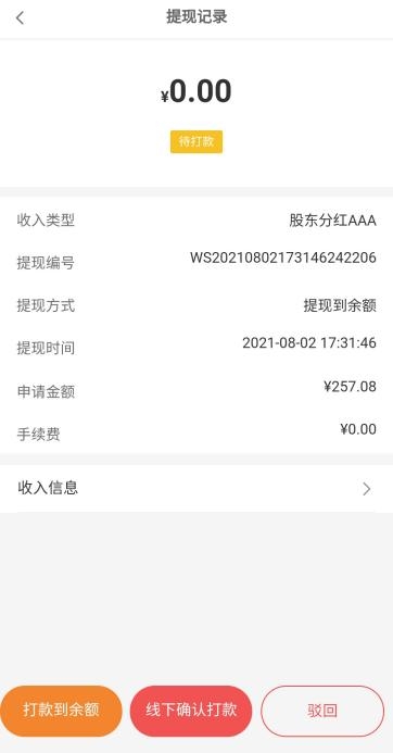 (4)操作:提交审核、重新审核、通过(打款到XX、线下确认打款)、驳回、无效