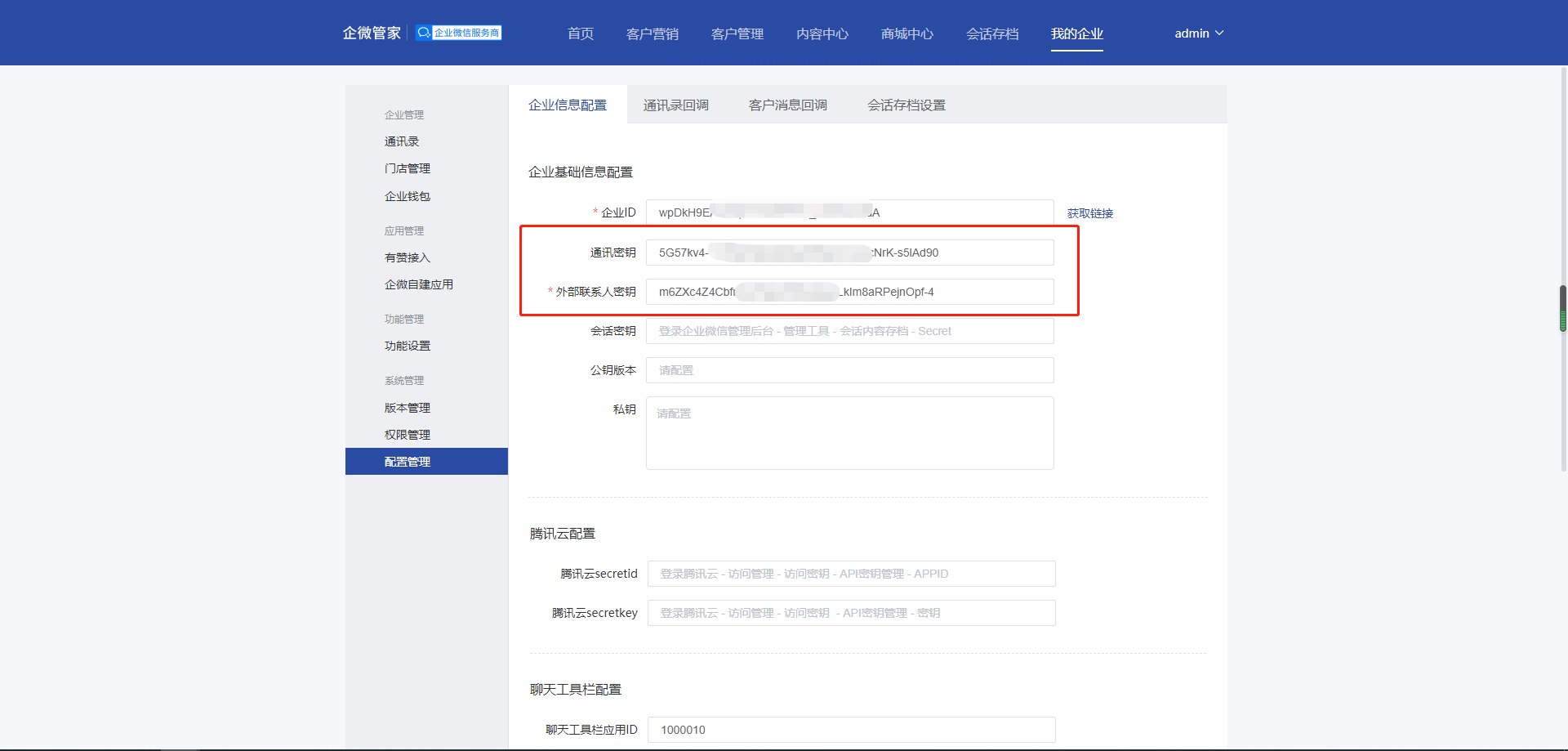 ## 11、点击、**我的企业——配置管理**。将通讯录同步Secret密钥和外部人联系Secret密钥分别填写进来保存即可。