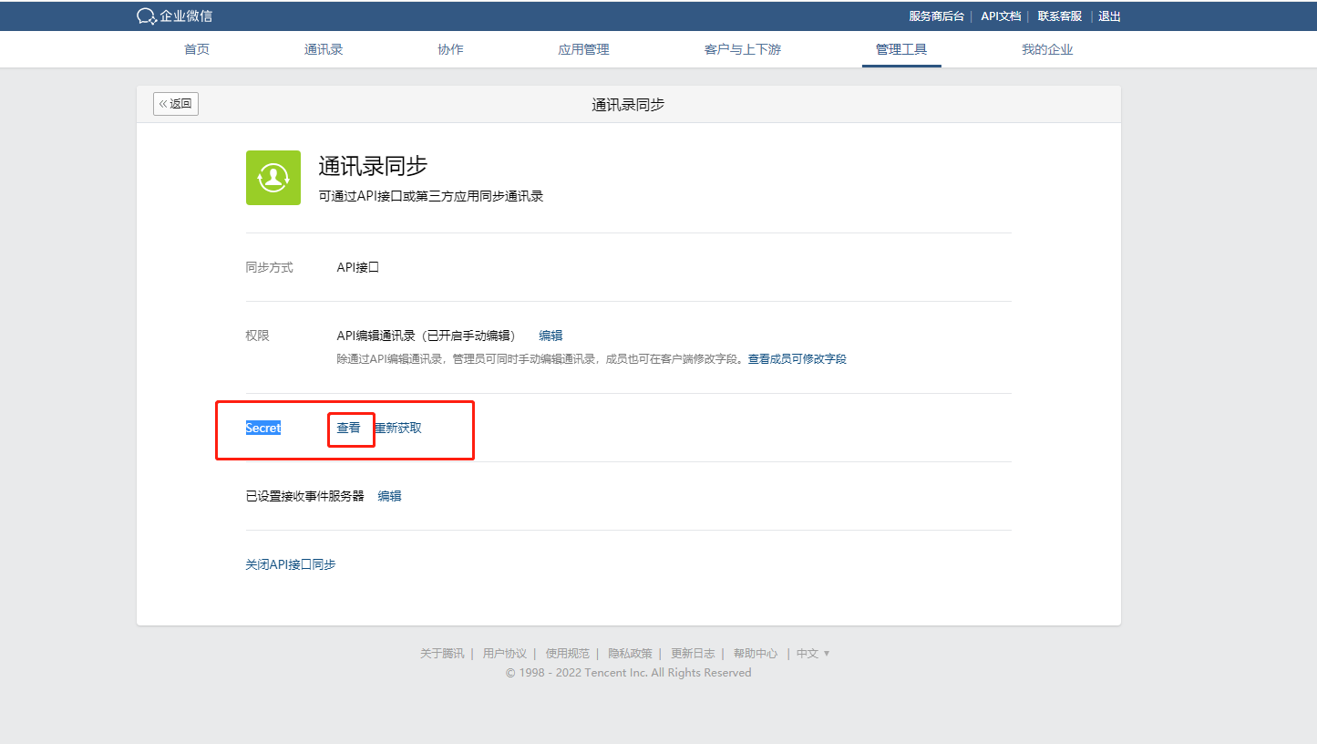 ## 8、点击管理工具,查看**通讯录同步Secret密钥**。