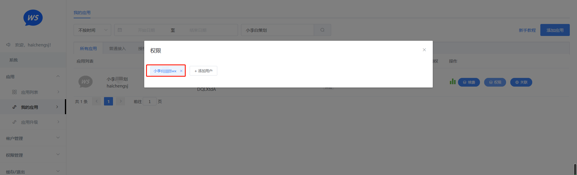 ## 5、给应用添加上账号权限。**应用——我的应用——权限**,权限内输入对应的账号即可。
