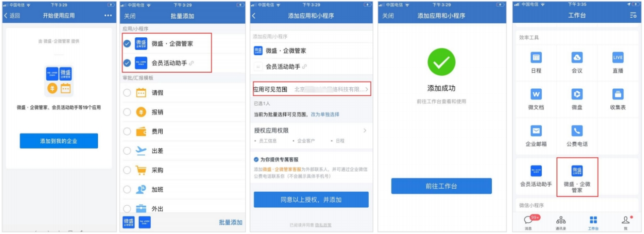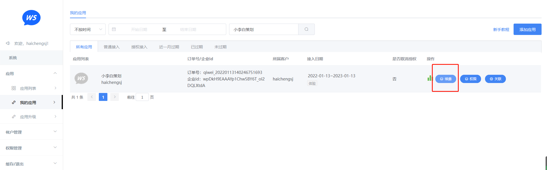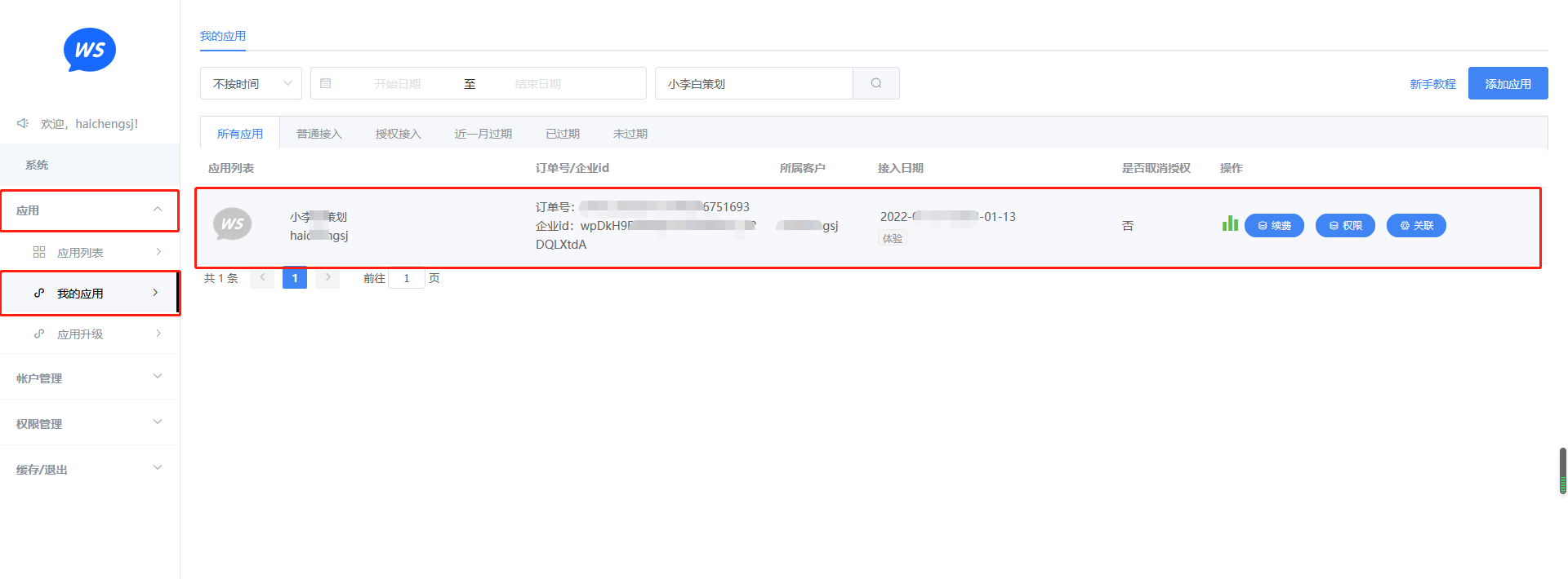 ## 3、扫码完成授权之后。**企微管家后台——应用——我的应用**会自动出现客户的企业微信信息。