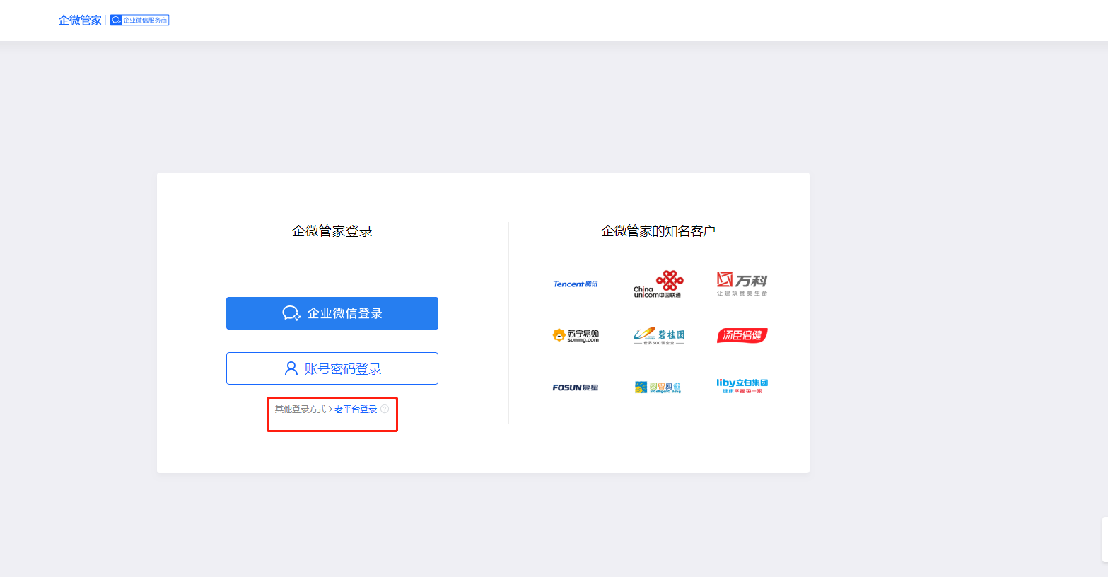 ## 10、登录企微管家后台。使用下方的**老平台**方式登录