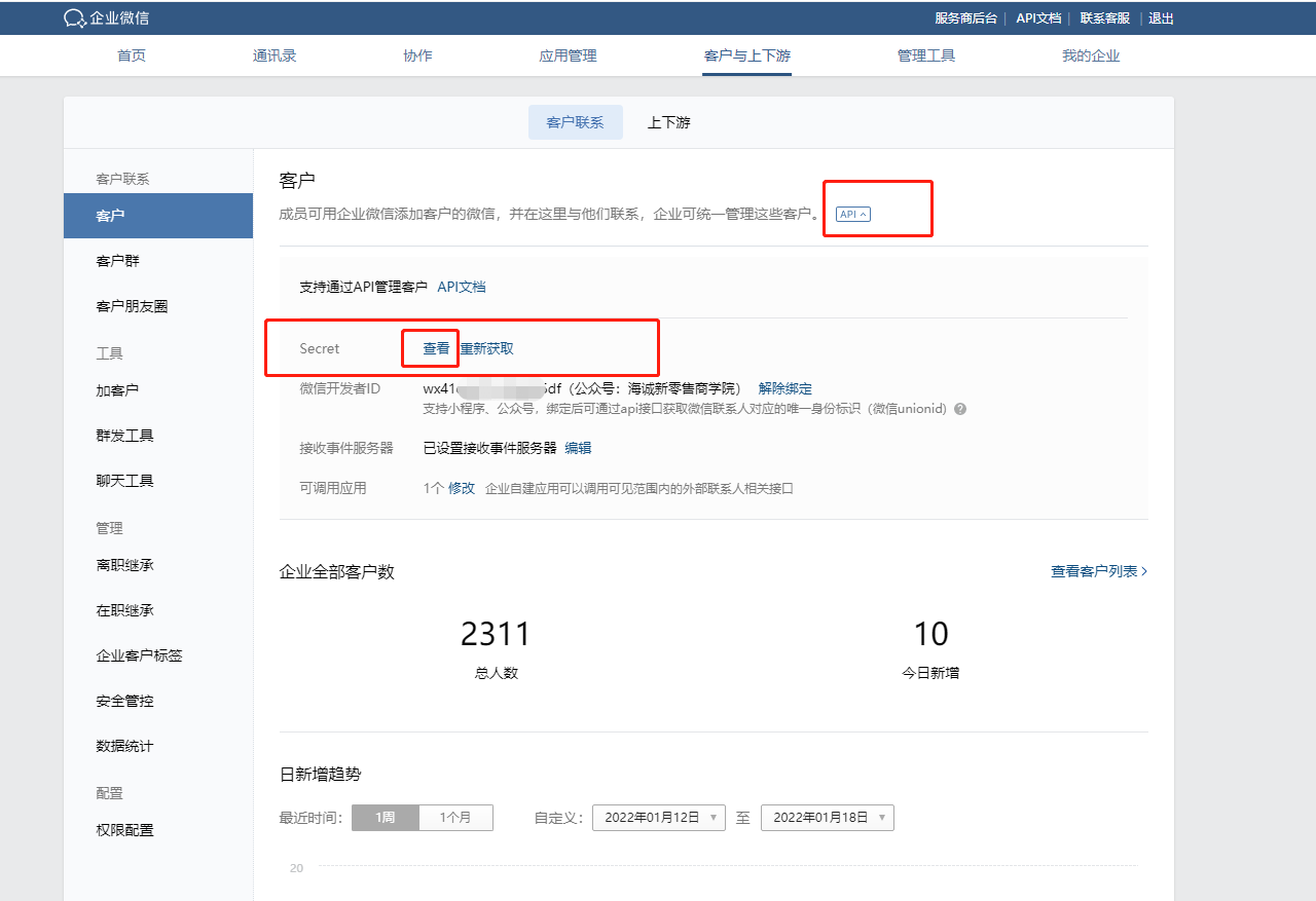 ## 9、获取**外部人联系Secret密钥**,点击**客户上下游——客户联系——客户——API。**