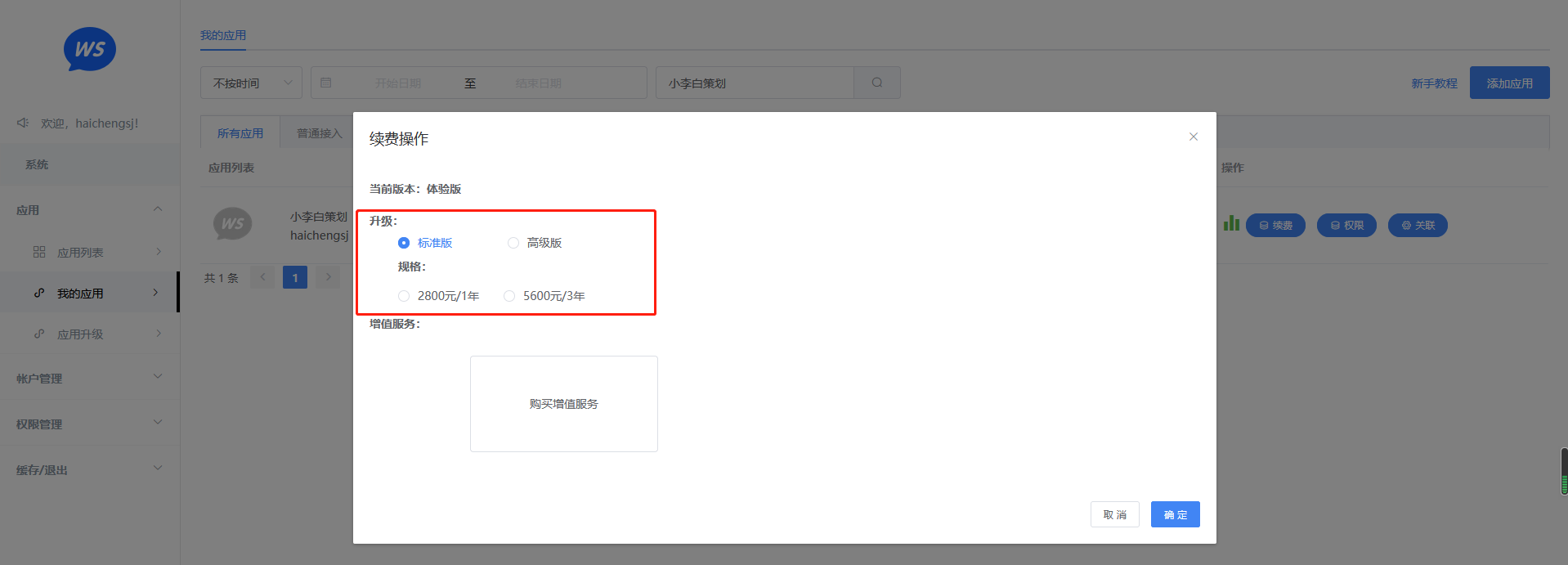 ## 6、点击**续费**选择套餐版本。公用两个套餐选择,**标准版**和**高级版**。根据客户套餐对应选择套餐即可。
