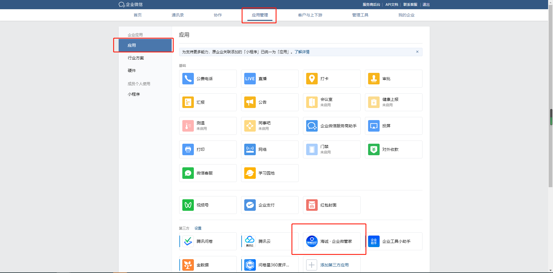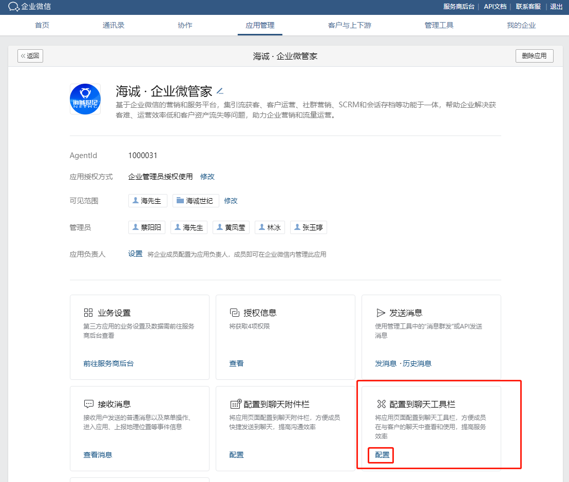 ## 2、点击**应用管理——海诚 · 企业微管家——配置到聊天工具栏**