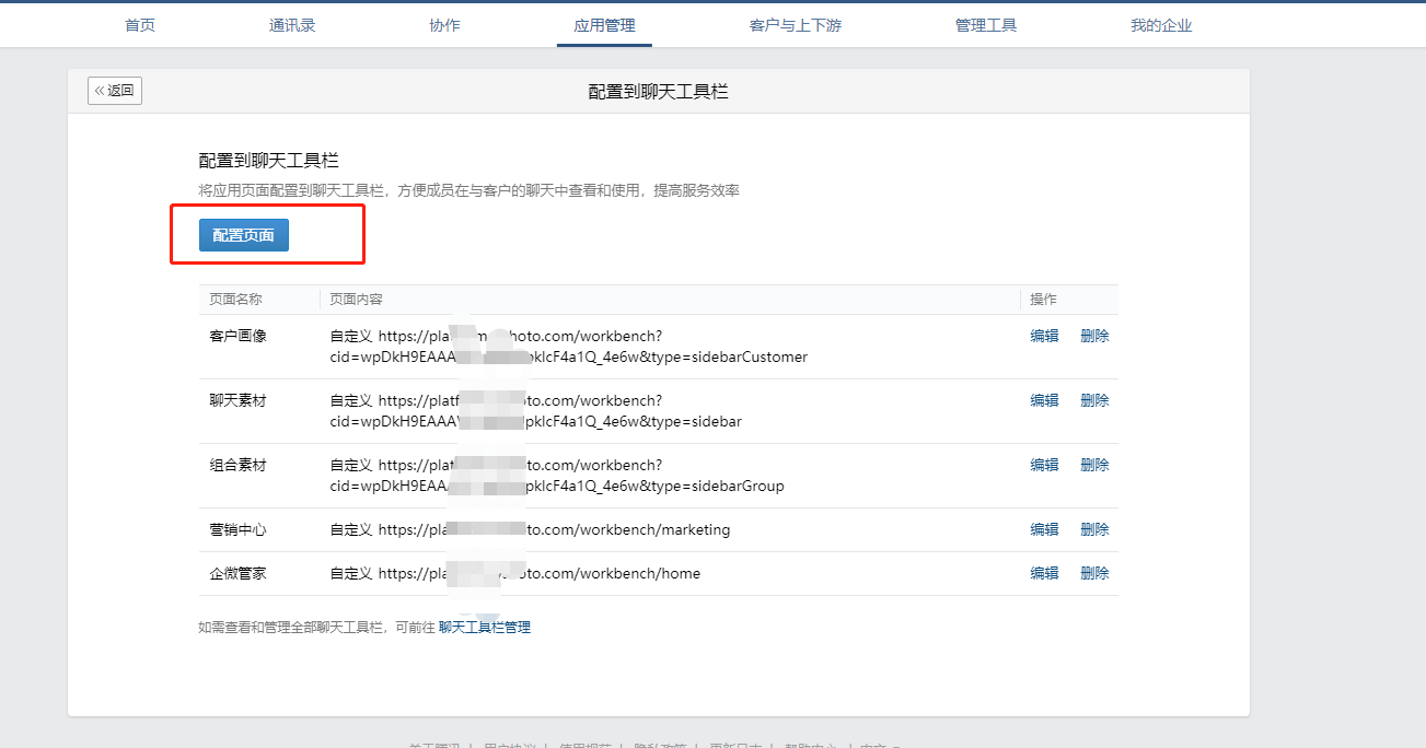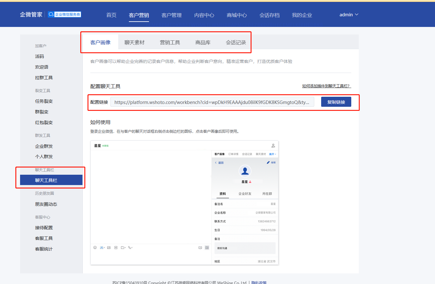 ## 4、登录企微后台,点击**客户营销——聊天工具栏**,客户画像、聊天素材、营销工具、都可以添加到企业微信工具栏内。