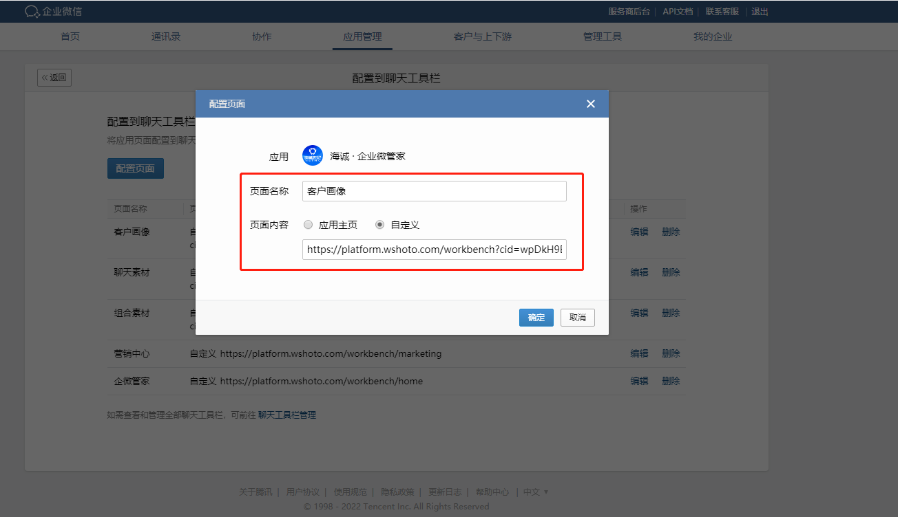 ## 3、配置页面,选择自定义,链接来源主要是在企微管家后台上进行获取。
