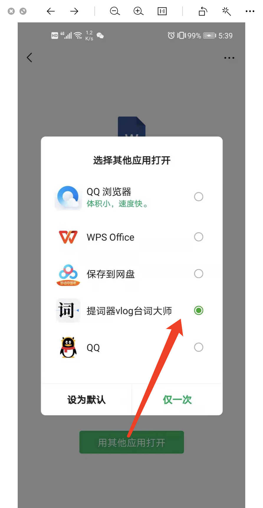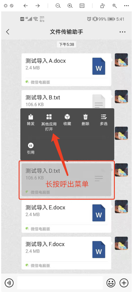 ### 第二步:找到发送的文档,长按呼出菜单,选择用【其他应用打开】(如下图:)