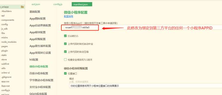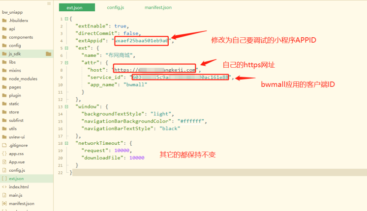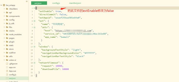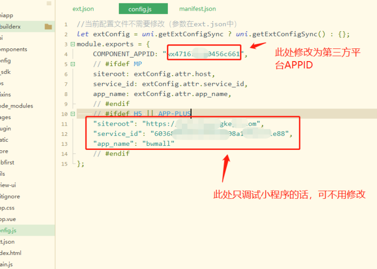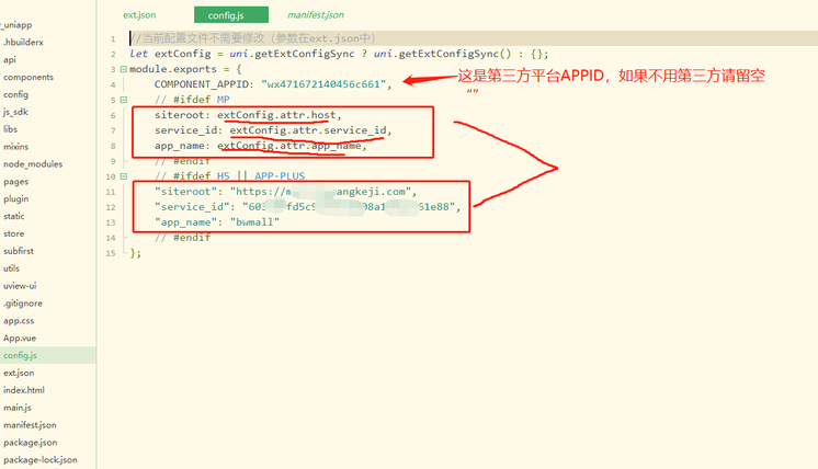 2 把config.js文件中的调用函数uni.getExtConfigSync地方都写固定的你自己的相关值,不用第三方,函数uni.getExtConfigSync已经取不到相关的值了;
