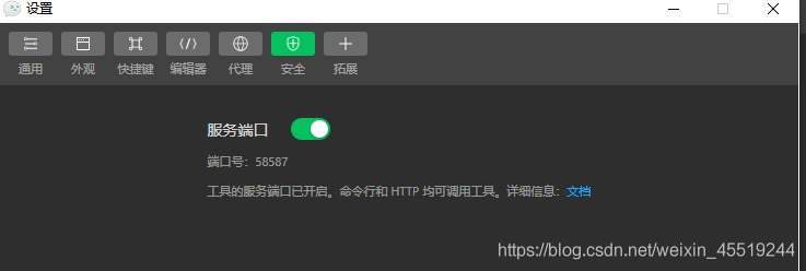 先打开微信开发者工具,进入编辑器页面后。点击【设置】 – 【安全】,开启【服务端口】,然后关闭设置窗口,关闭开发者工具。