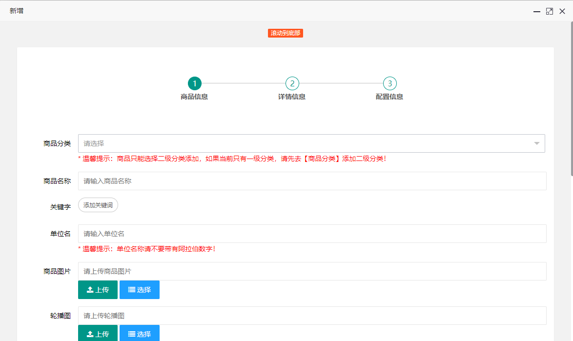 1. 商品添加为分步添加:**商品信息→商品详情→其他设置**,带 \* 为必填选项