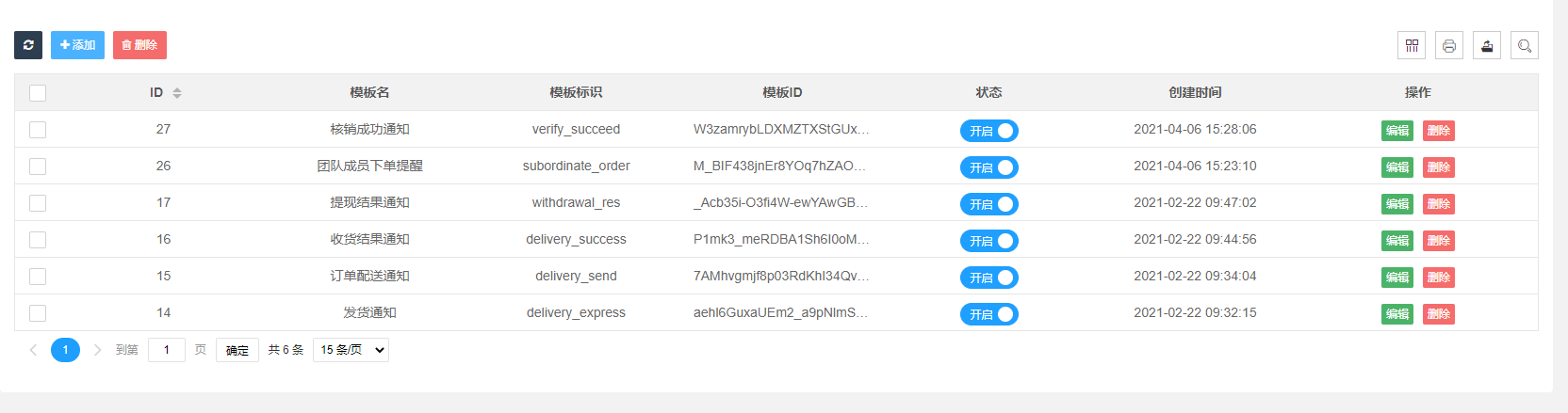 3.根据本页面模板列表在微信后台添加对应模板,添加成功后修改对应记录的模板ID