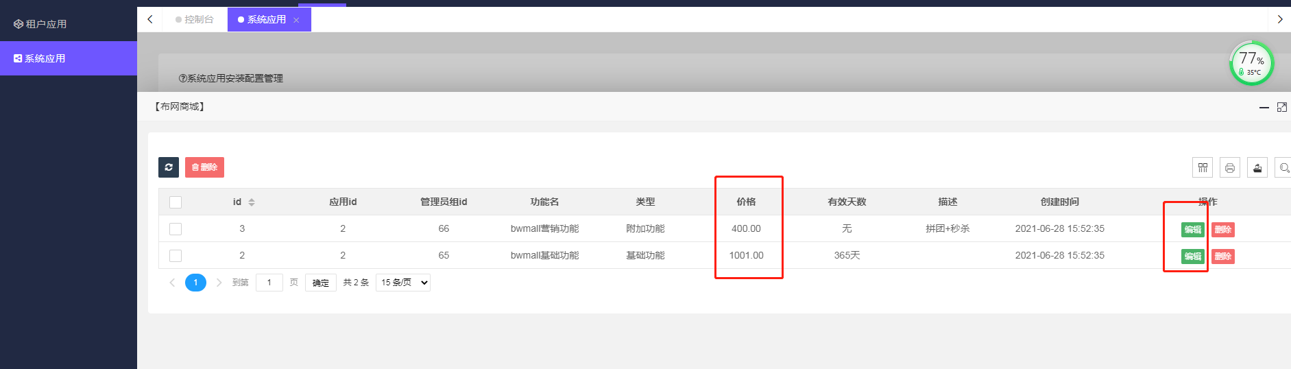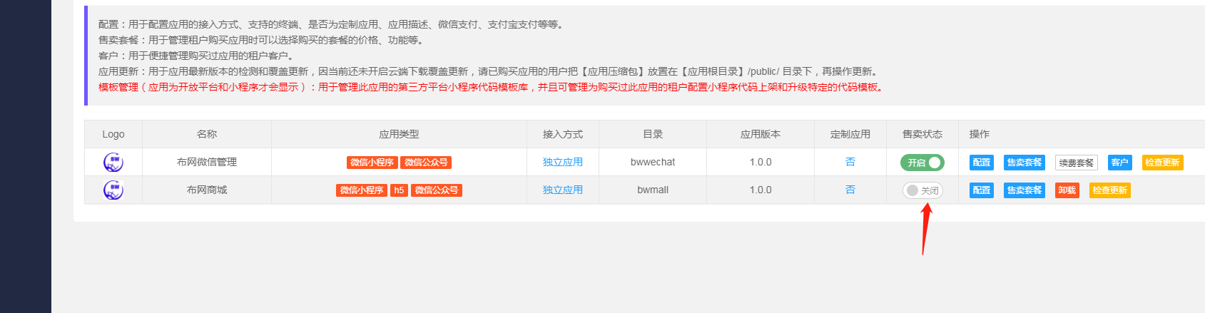 3应用**售卖状态**打开,配置**售卖套餐**价格,也进入应用相应的**配置**菜单进行配置。