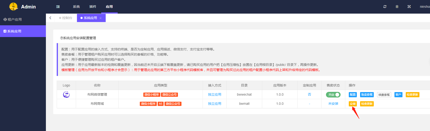 2.登录运营平台后台**http://域名/manage/admin/login**,进入图示的菜单,找到布网商城-》单击安装,等待安装完毕。