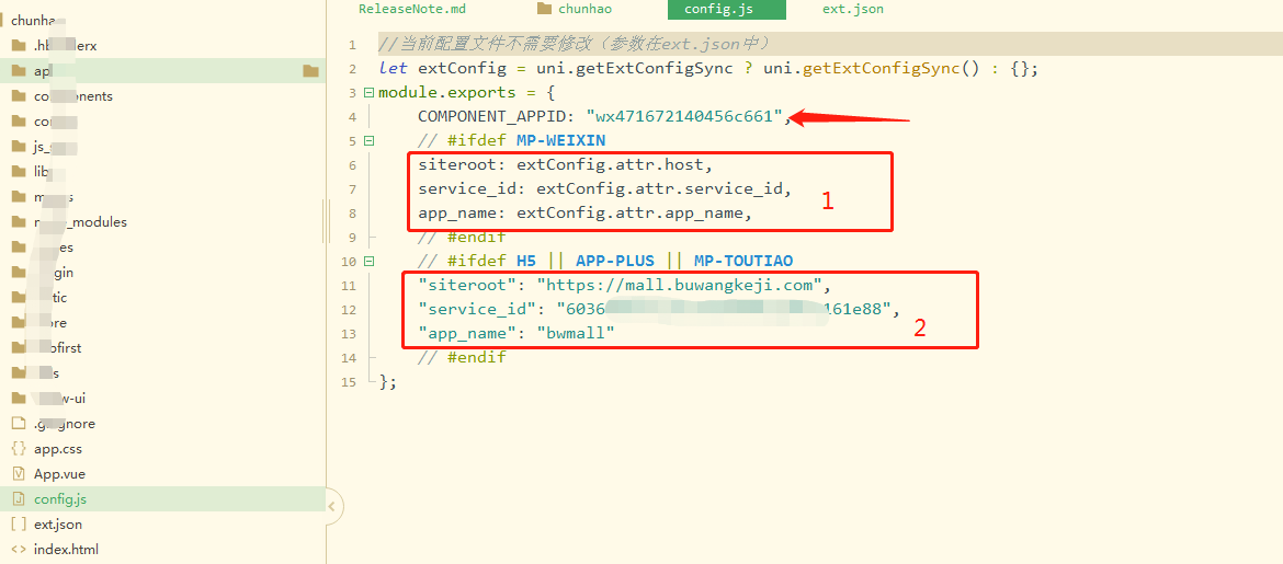 6 找到根目录文件config.js,单独配置对接,就把第三方平台调试模式下才用到的参数COMPONENT_APPID修改为空,把**1标识**的地方修改为和**2标识**一样,进行小程序的打包调试