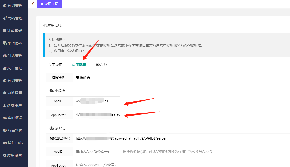 4 登录租户后台bwmall应用管理后台https://域名/manage/member/index,填写刚设置的APPid和AppSecret