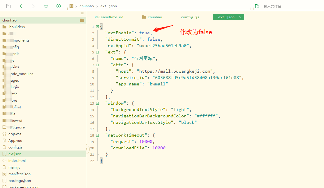 找到ext.json【第三方平台用到的调试文件】,修改参数extEnable为false