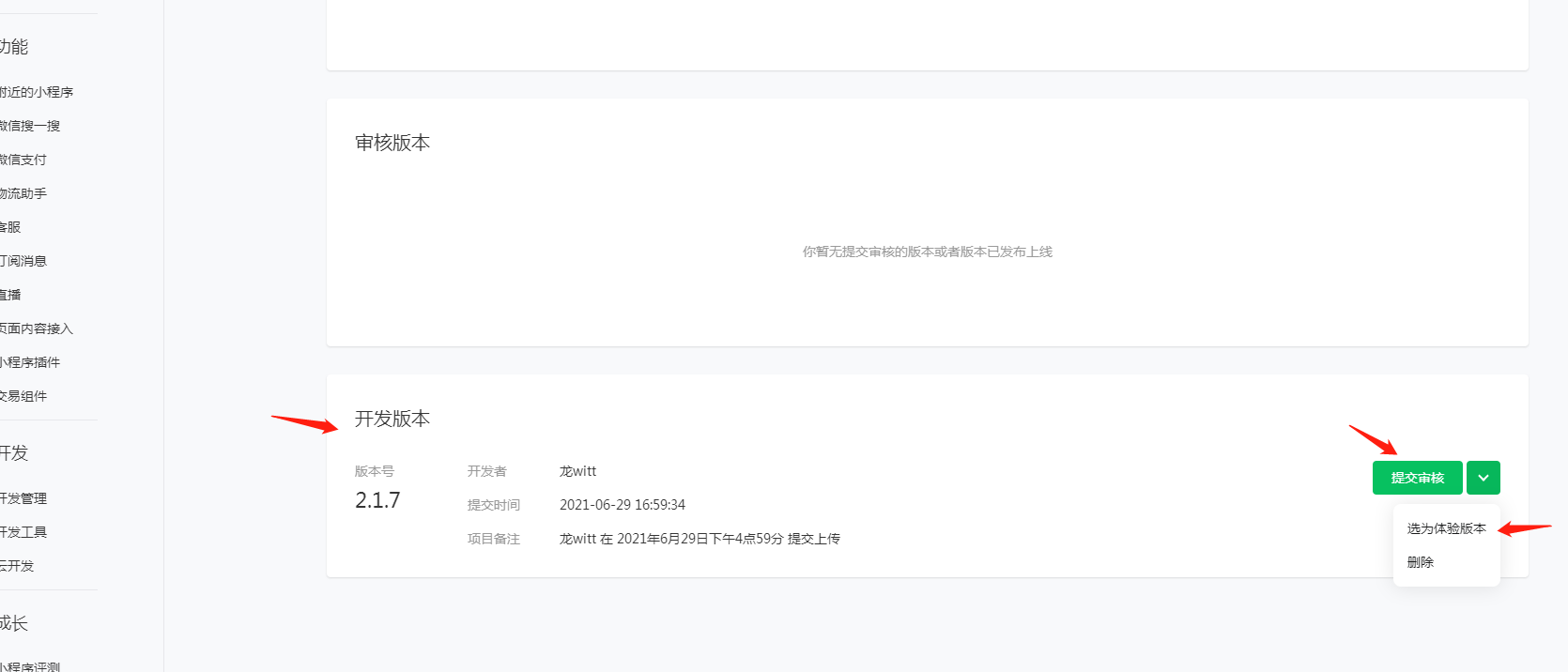 12 登录小程序管理后台,提交版本代码,也可以先选为体验版本先扫码体验,没有问题后再提交审核