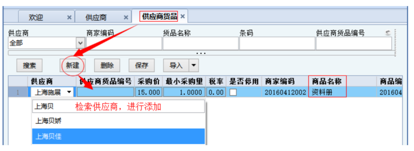 1. 操作:【设置】-【采购】-【供应商货品界面】-【新建】;
