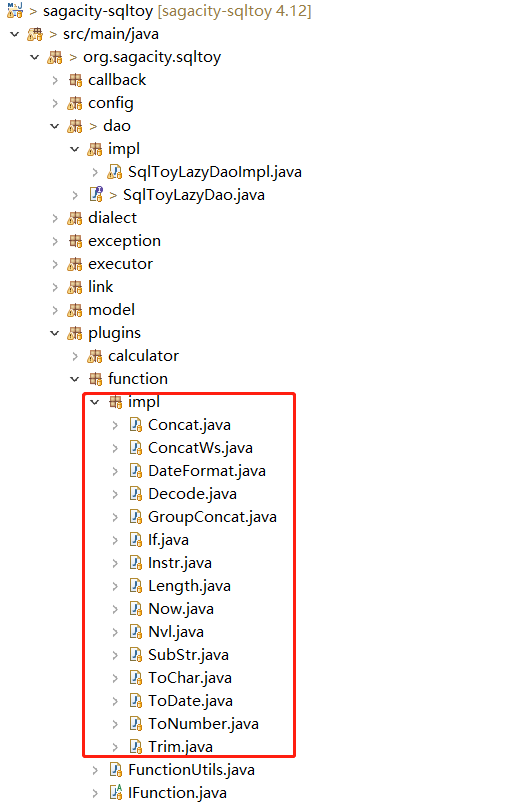 如果想要用自定义的实现类覆盖sqltoy自带的,只要类名称在不区分大小写的情况下跟sqltoy的函数类名称一致就会优先使用自定义的。
