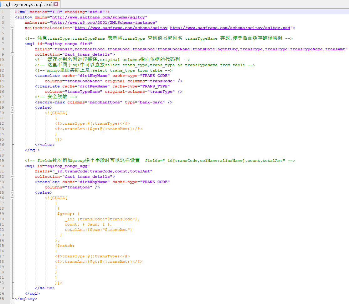 参见范例中的sqltoy-mongo.sql.xml文件: