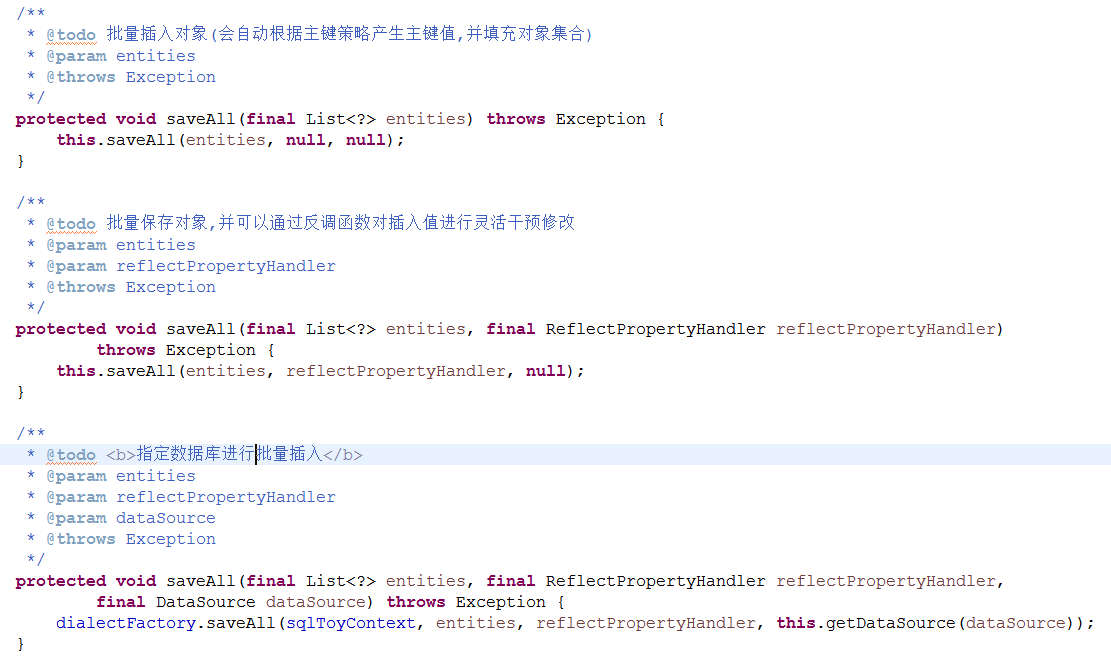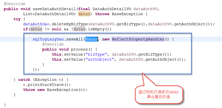 * 应用范例:ReflectPropertyHandler 是一个针对saveAll的集合数据的反调,通过反调给集合属性赋值。