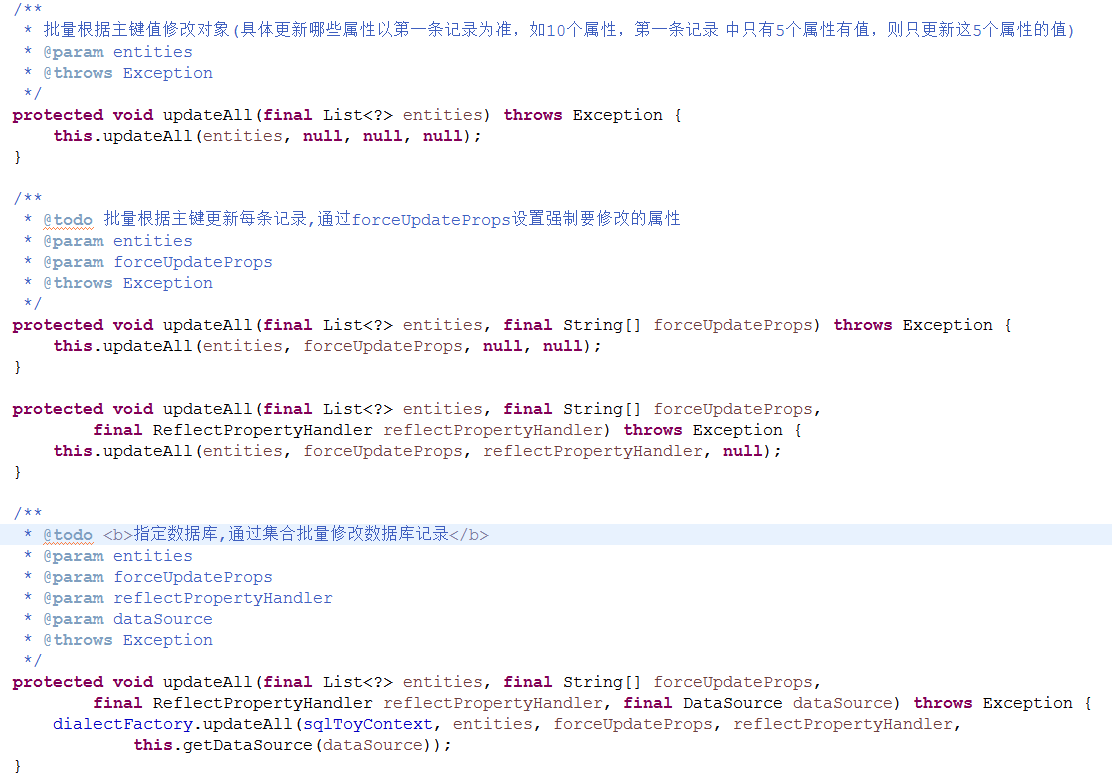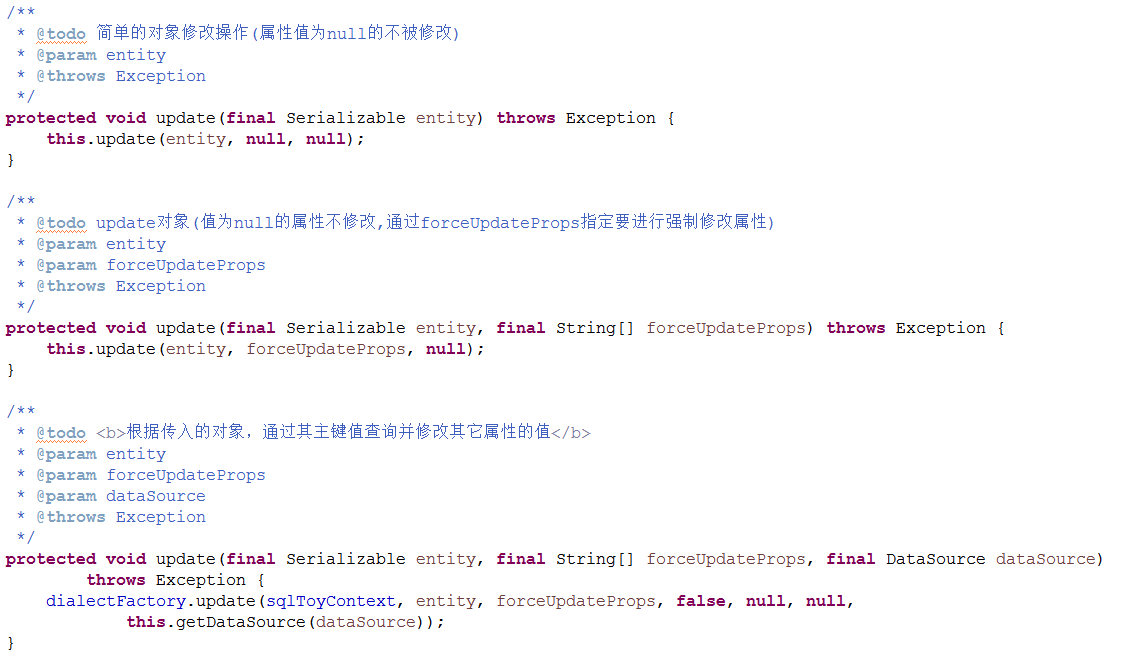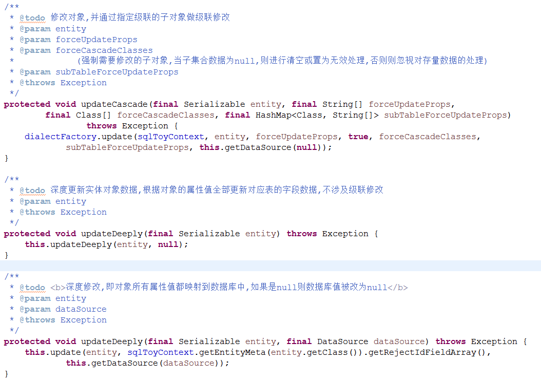 update操作默认不会对属性值为null对应的字段值修改,场景:一个审核流程,不同的角色只维护特定的字段值,如果全部字段进行update就必然需要先加载对象值然后再update,在高并发环境下,可能会将其他用户刚维护的数据覆盖成之前的数据。如果要对某个字段进行强制修改,通过forceUpdateProps数组提供(对应VO对象的属性名称,无关大小写)。