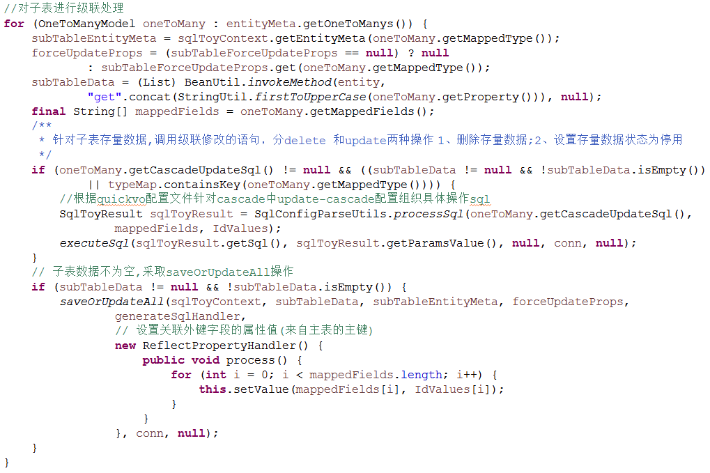 请参看quickvo.xml有关cascade的配置,delete表示对主表关联的子表的存量数据直接删除,也可以写成一个sql片段,如enabled=0 表示对修改关联的子表存量数据置为无效(请跟进实际表字段书写)