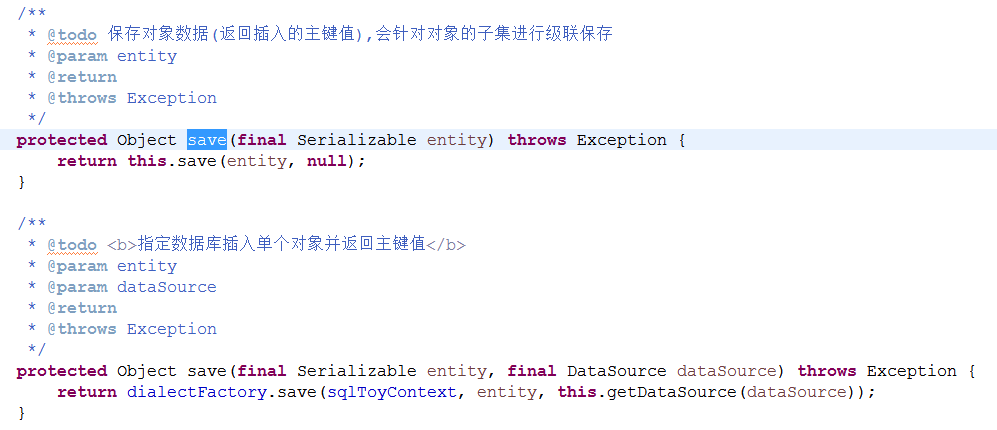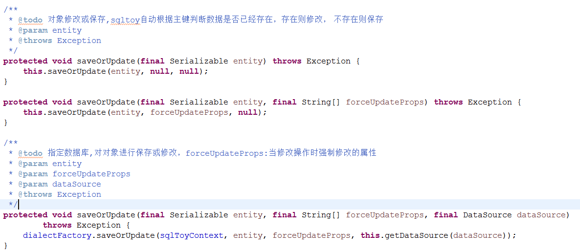 * 使用说明:sqltoy的saveOrUpdate底层充分利用数据库的特性只做一次性数据库交互完成操作,如oracle、sqlserver、db2等数据库使用merge into 语法,而mysql则使用