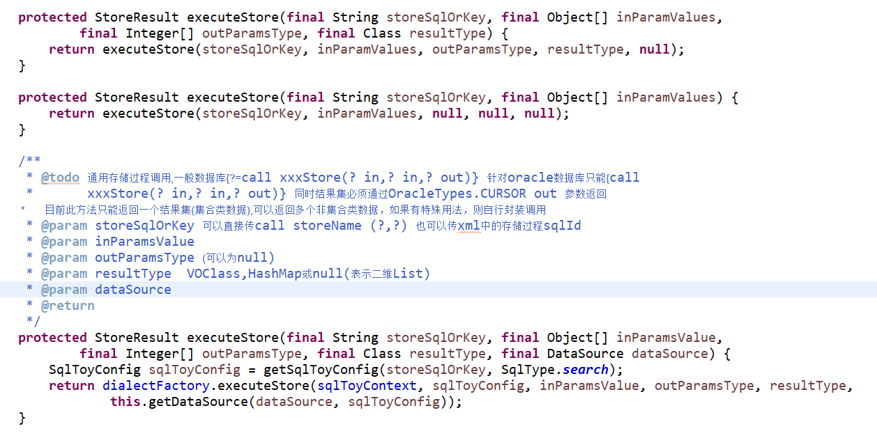 List result=sqlToyLazyDao.findBySql("{call storeName(:param1,:param2)}”,new String\[\]{“param1”,”param2”},new Object\[\]{value1,Value2},VO.class);