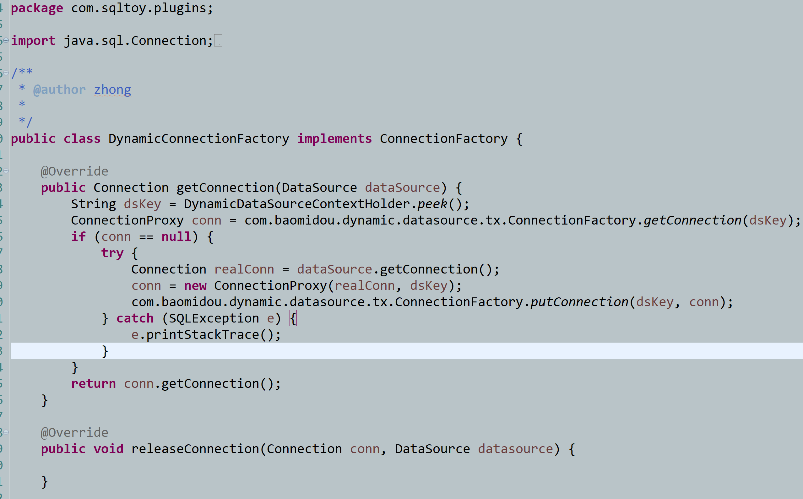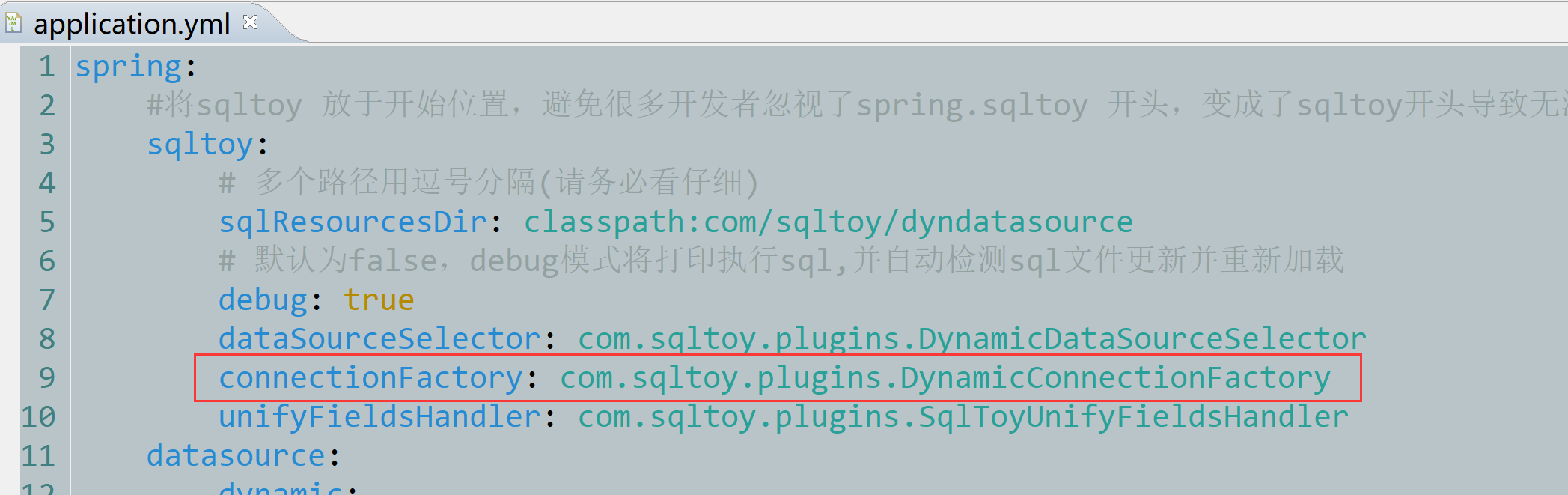 Sqltoy跟数据库连接有关系的唯有SqlToyContext中的connectionFactory,可以自行实现org.sagacity.sqltoy.plugins.connection.ConnectionFactory接口,依据插件特点获得当前connection和归还释放connection