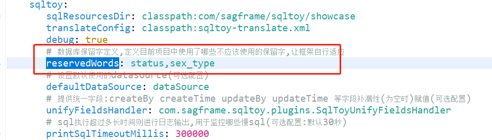 * 在sqltoyContext中指定reservedWords 属性,定义当前系统中用到的保留字
