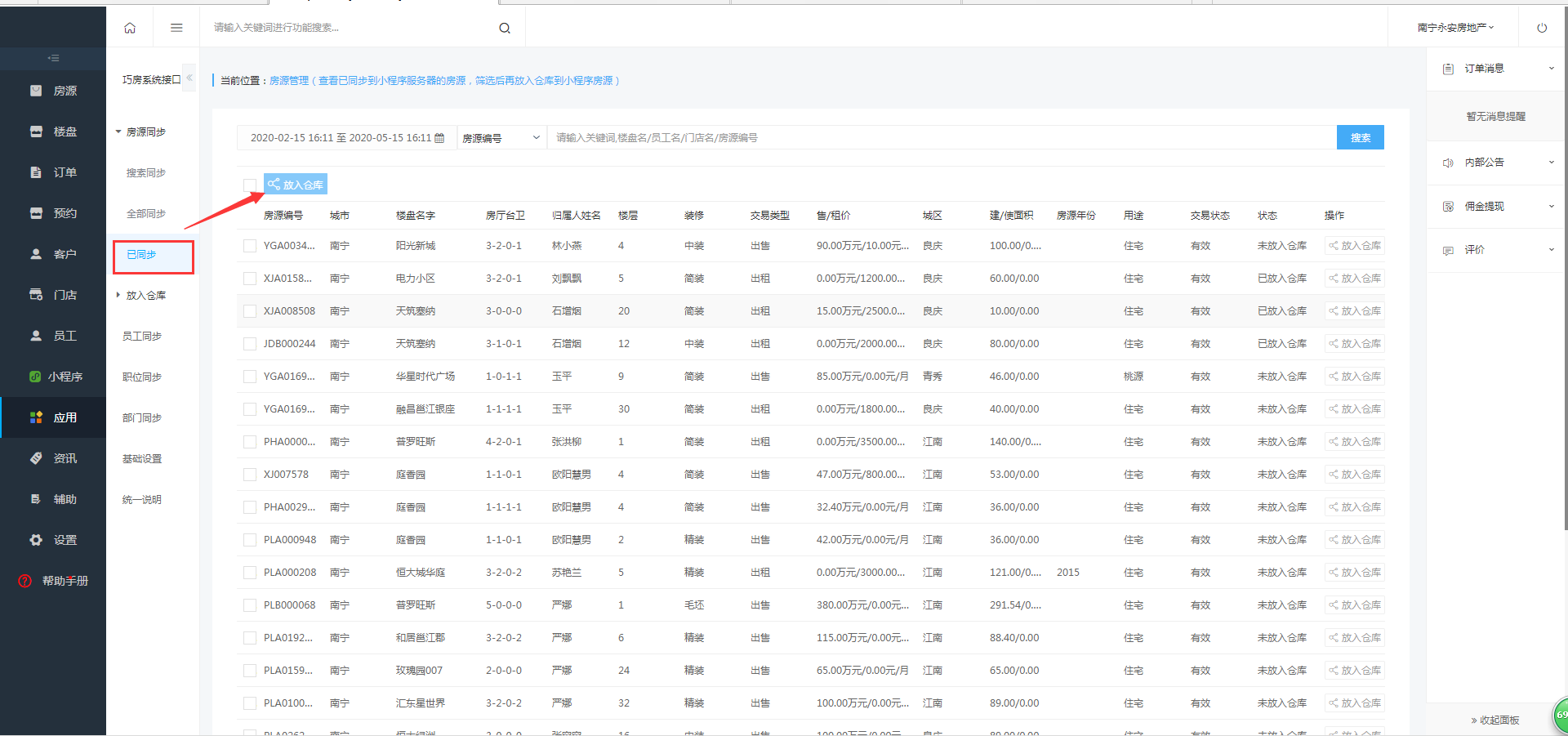 已同步的意思就是从巧房系统的房源已经同步到小程序的后台,可以点击放入仓库中