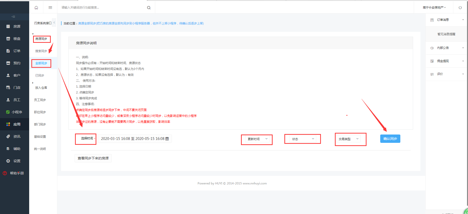 进入巧房系统接口,点击房源同步,在全部同步这里,你可以根据时间,时间类型、状态、交易类型来同步你想要的房源放在小程序的系统里
