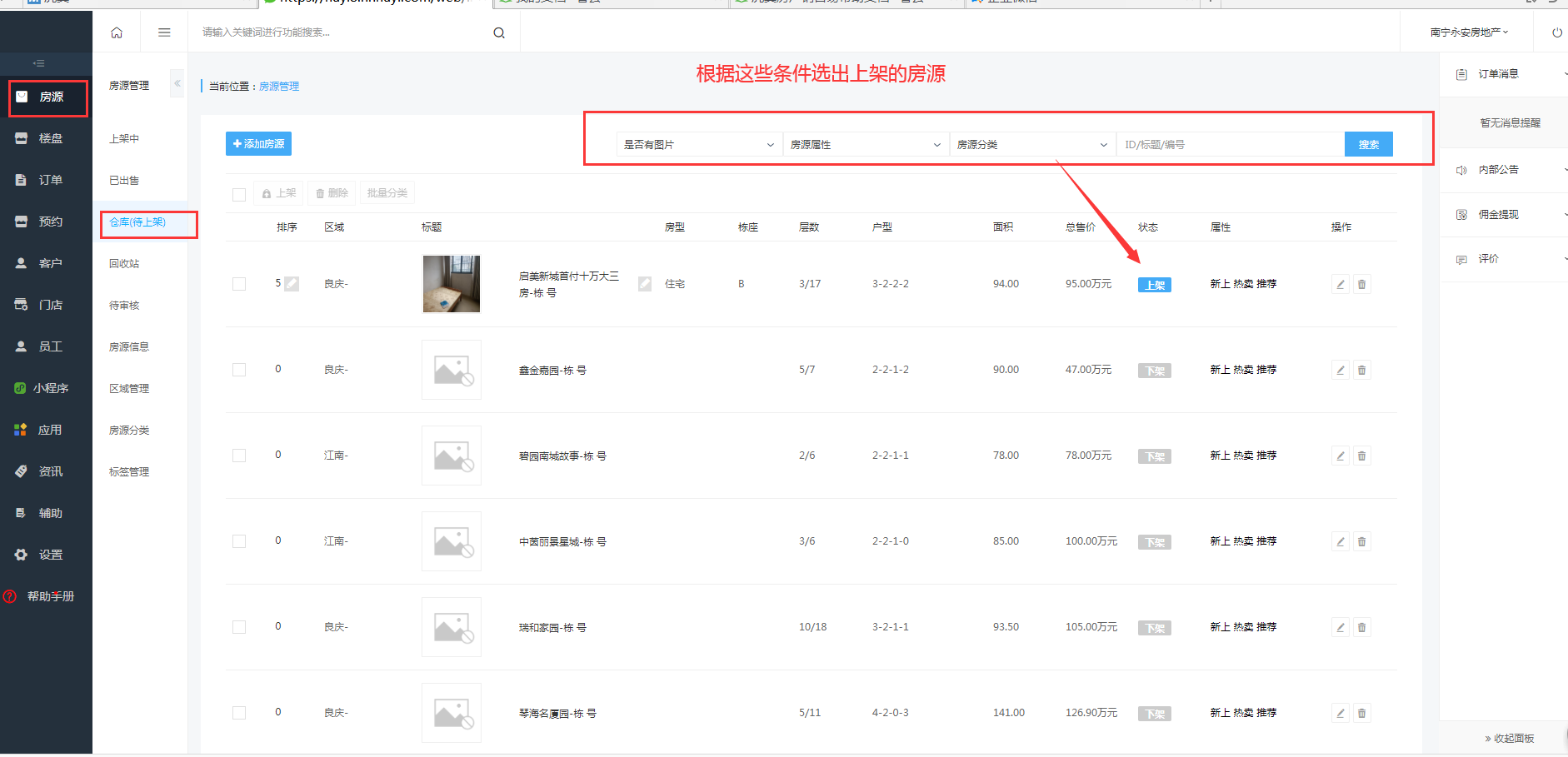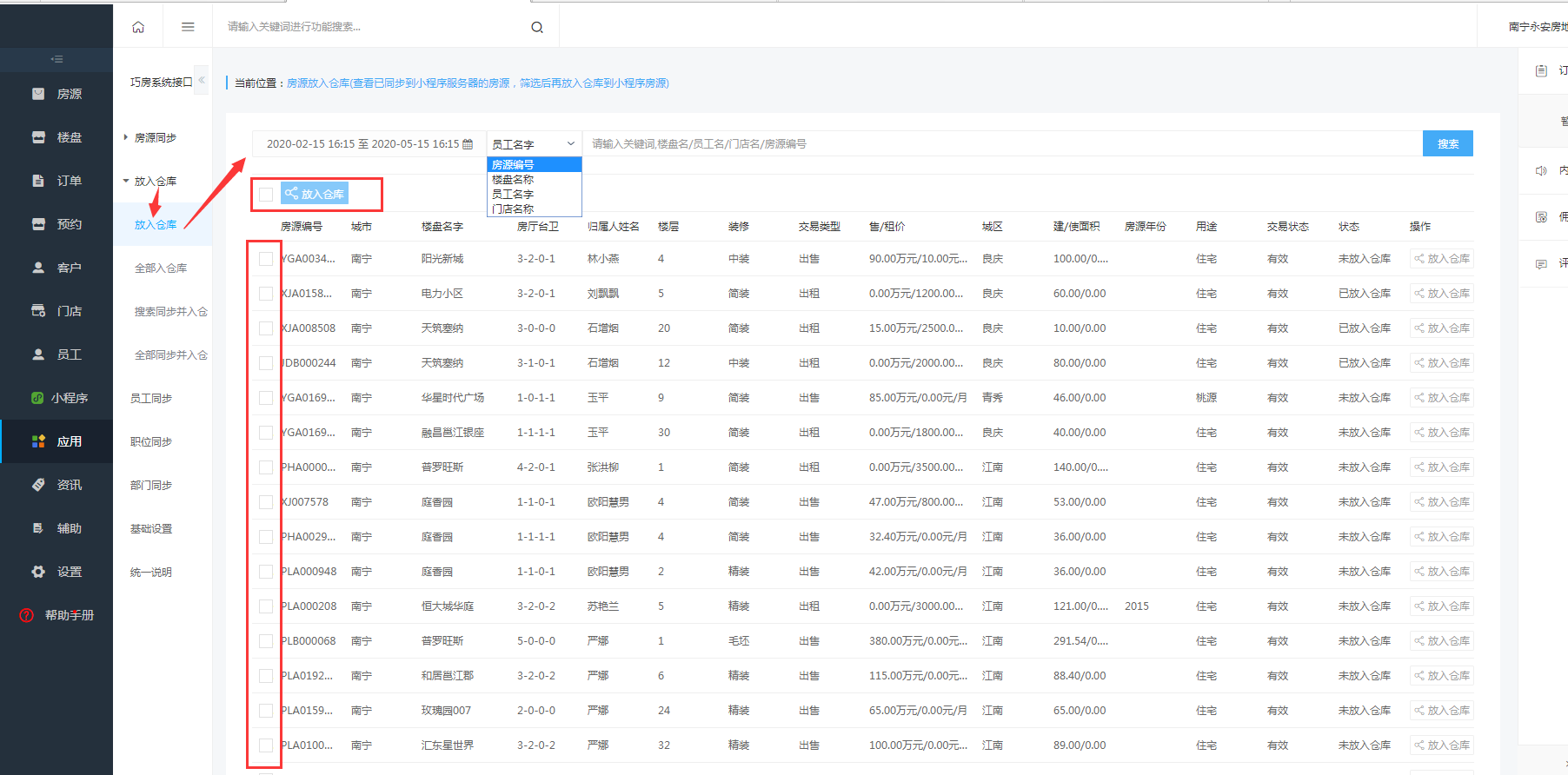 点击放入仓库,在这里你可以根据时间、房源编号,楼盘名称,员工名字、门店名字进行搜索,搜索到的房源在房源的边框打钩,在房源上方红色边框点击放入仓库中,就可以更新到房源的仓库中(待上架)