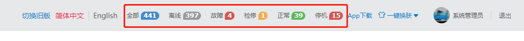 2. 登录“工作台”页面后右上角显示本用户当前所有电梯状态数据,状态分为离线、故障、检修、正常,停机五种。