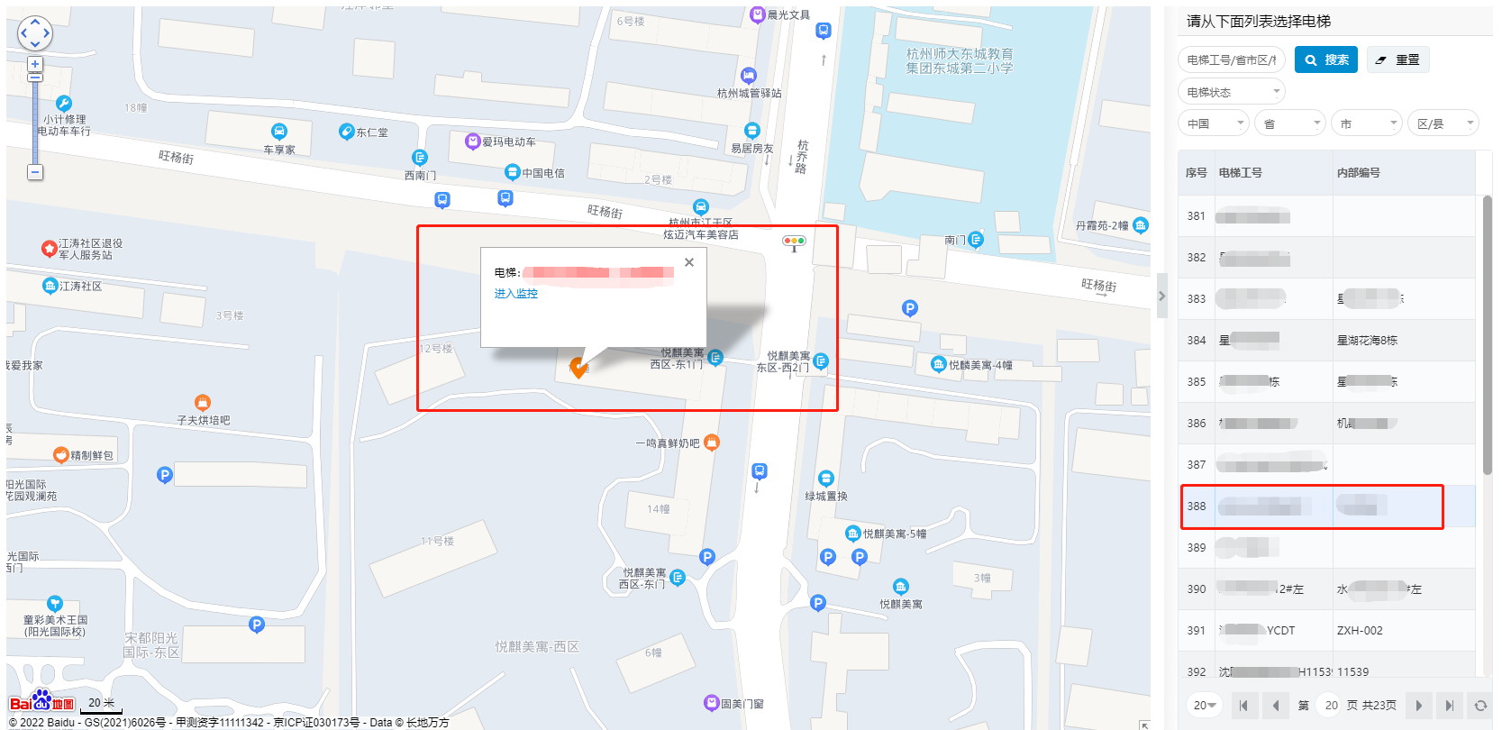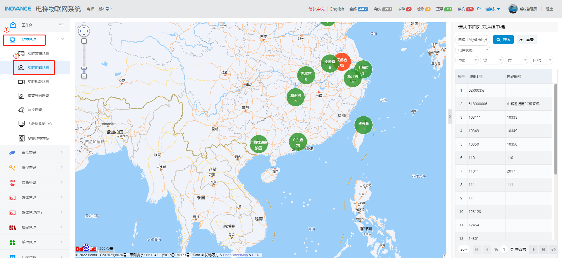1. 登录电梯物联网平台,选择“监控管理>实时地图监测”,可查看所有设备在各省份的分布概览。