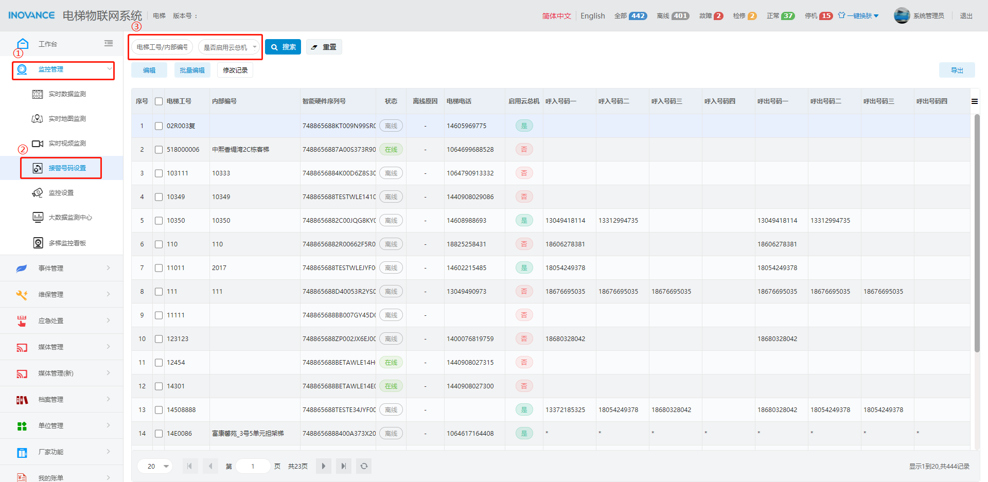 1. 登录电梯物联网平台,选择“监控管理>接警号码设置”,进入“接警号码设置”页面,支持通过电梯工号、内部编号、是否启用云总机进行电梯搜索。