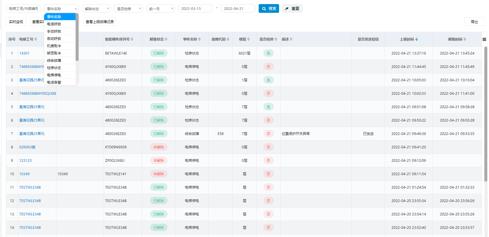 事件名称包括电话呼救、手动呼救、自动呼救、机房刷卡、轿顶刷卡、综合故障、检修状态、电梯停电、电话告警、通话异常、云总机通话、电压检测、维保签到。