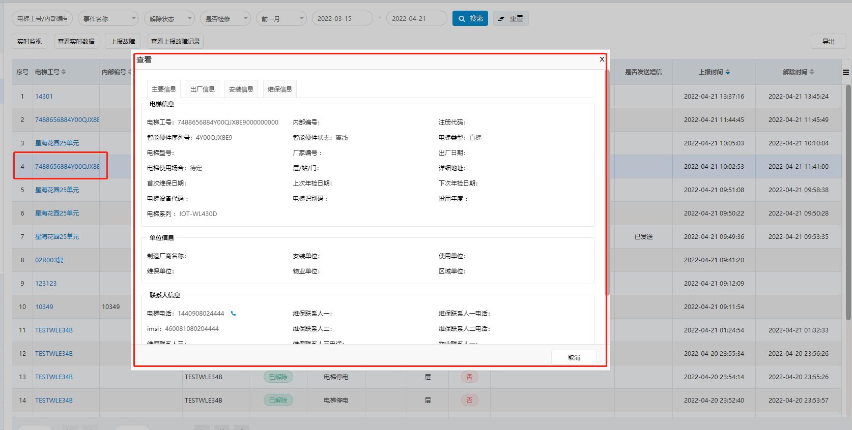 1. 单击具体电梯,进入电梯详情页面,可查看“主要信息”、“出厂信息”、“安装信息”、“维保信息”。