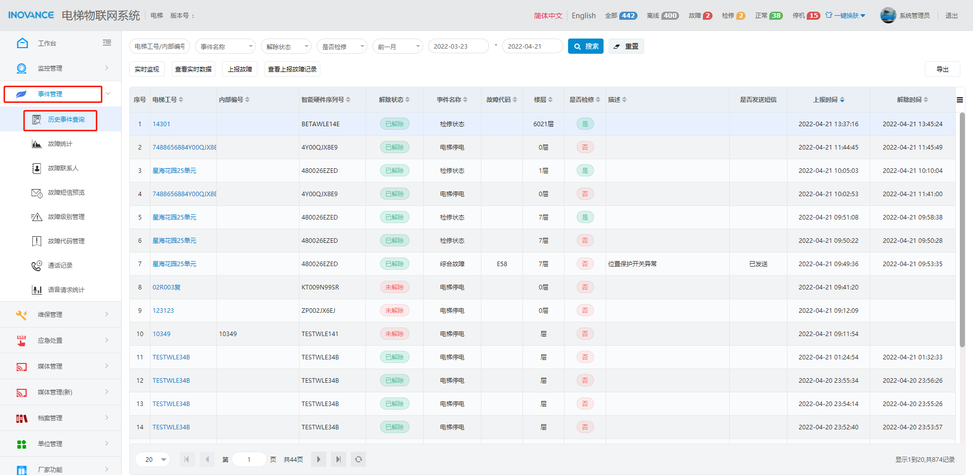 1. 登录电梯物联网平台,选择“事件管理>历史事件查询”,进入“历史事件查询”页面。