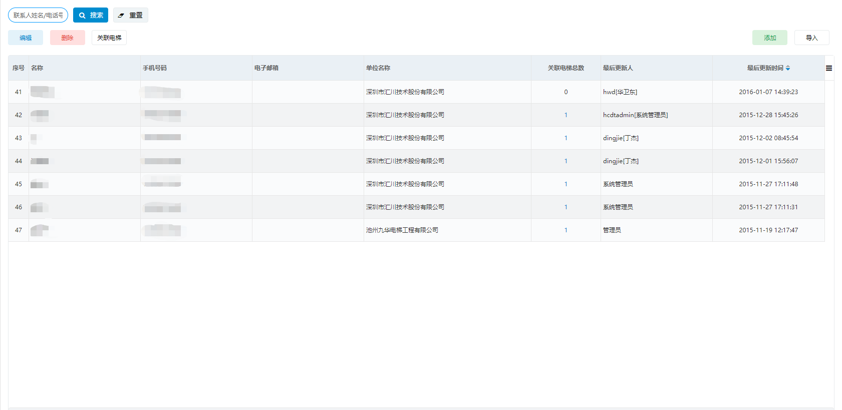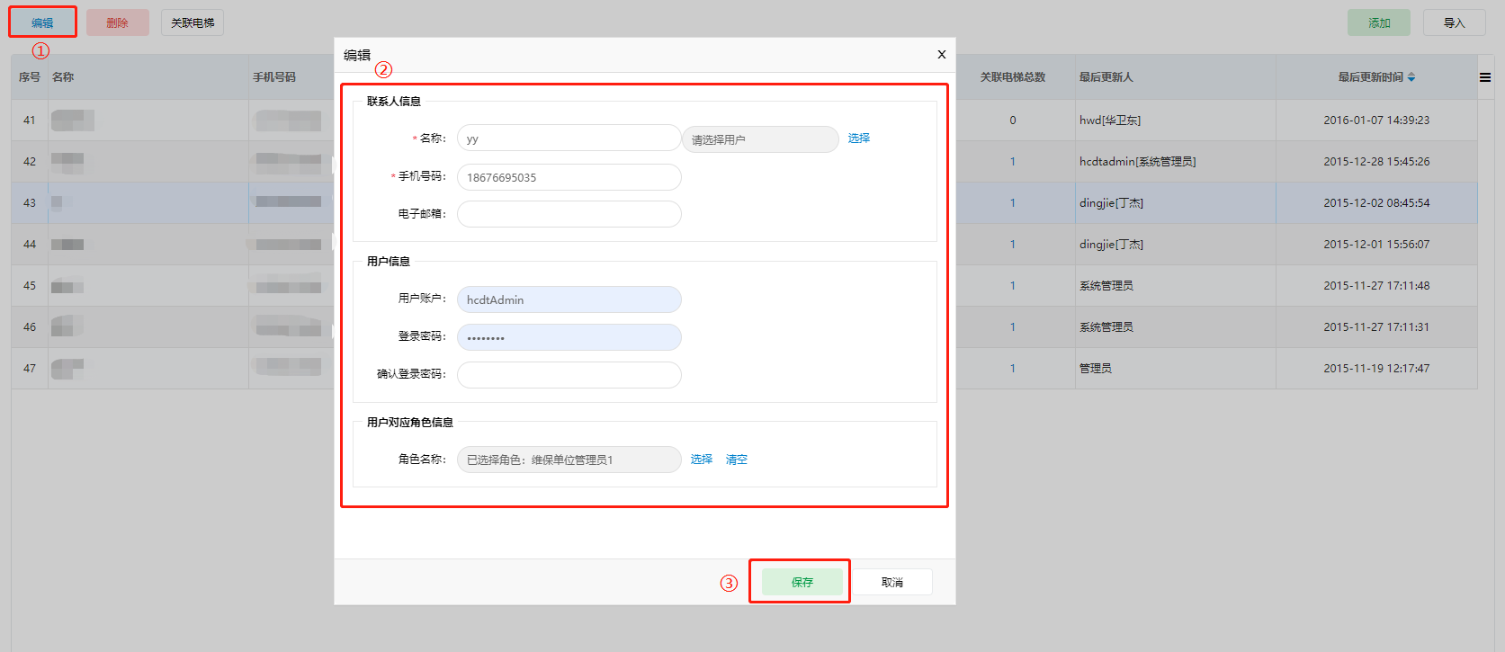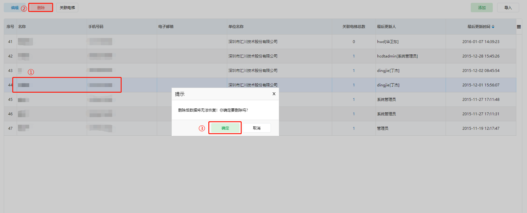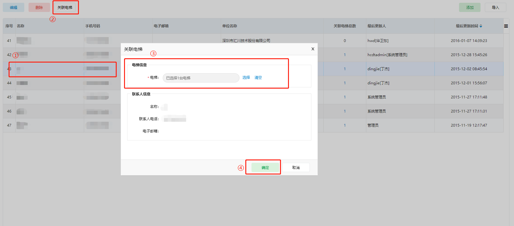1. 选择一个联系人,单击左上角“关联电梯”按钮,弹出关联电梯对话框,选择电梯信息后,单击“确定”按钮,完成绑定。