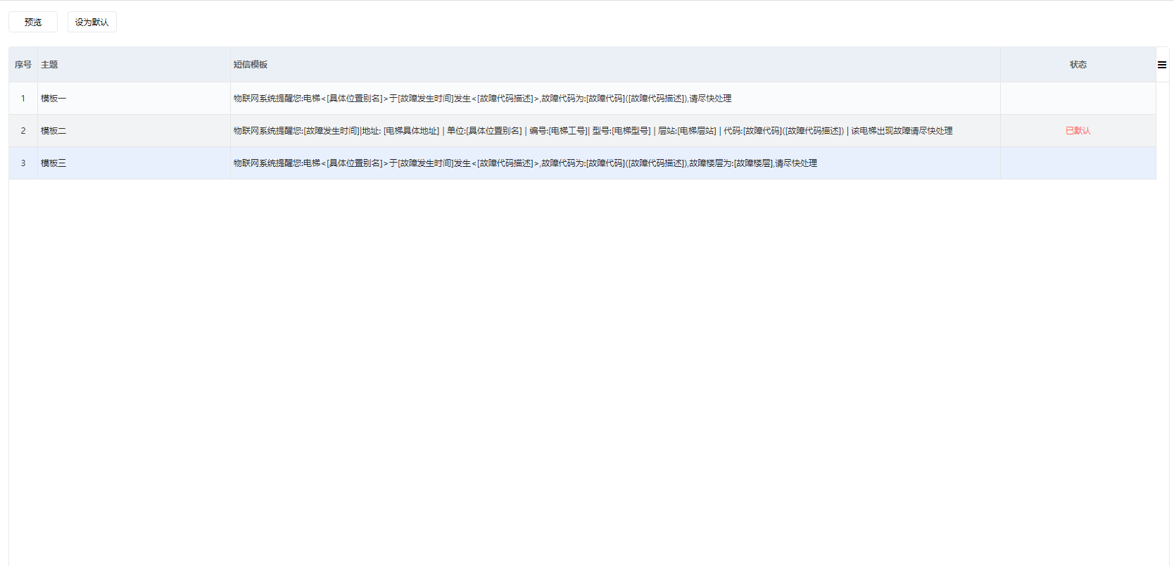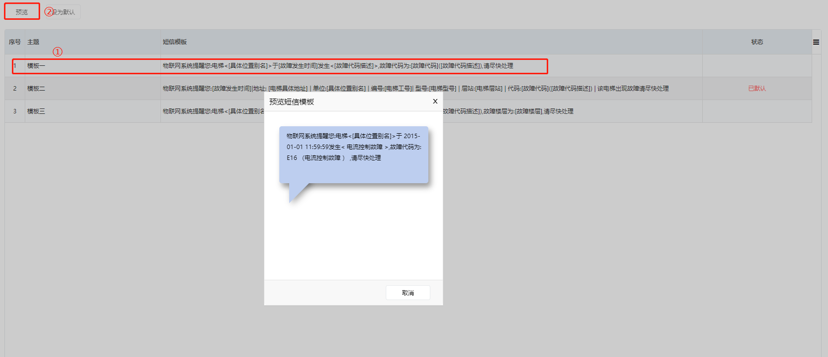 用户可以通过此项功能预览及查看故障短信模板,短信模板为系统默认,如需修改或删除,请联系汇川客服进行处理。